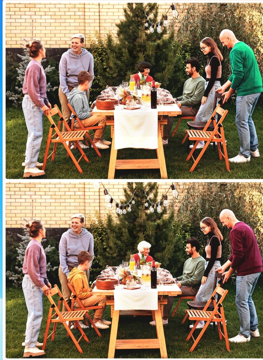 Logo abaixo, você vai ver duas figuras que retratam a mesma família reunida na mesa em um dia comum. Alguém tirou a foto que você está vendo nas duas imagens abaixo e na hora de revelar cometeu alguns erros trocando cores de lugar e até movendo objetos. Nesse sentido, será que você consegue perceber o erro que cometeram e apontar cinco diferenças entre as figuras para que o pessoal do Photoshop possa realizar o conserto disso? Análise as duas figuras e veja se você consegue perceber o que está errado entre elas em menos de 10 segundos: