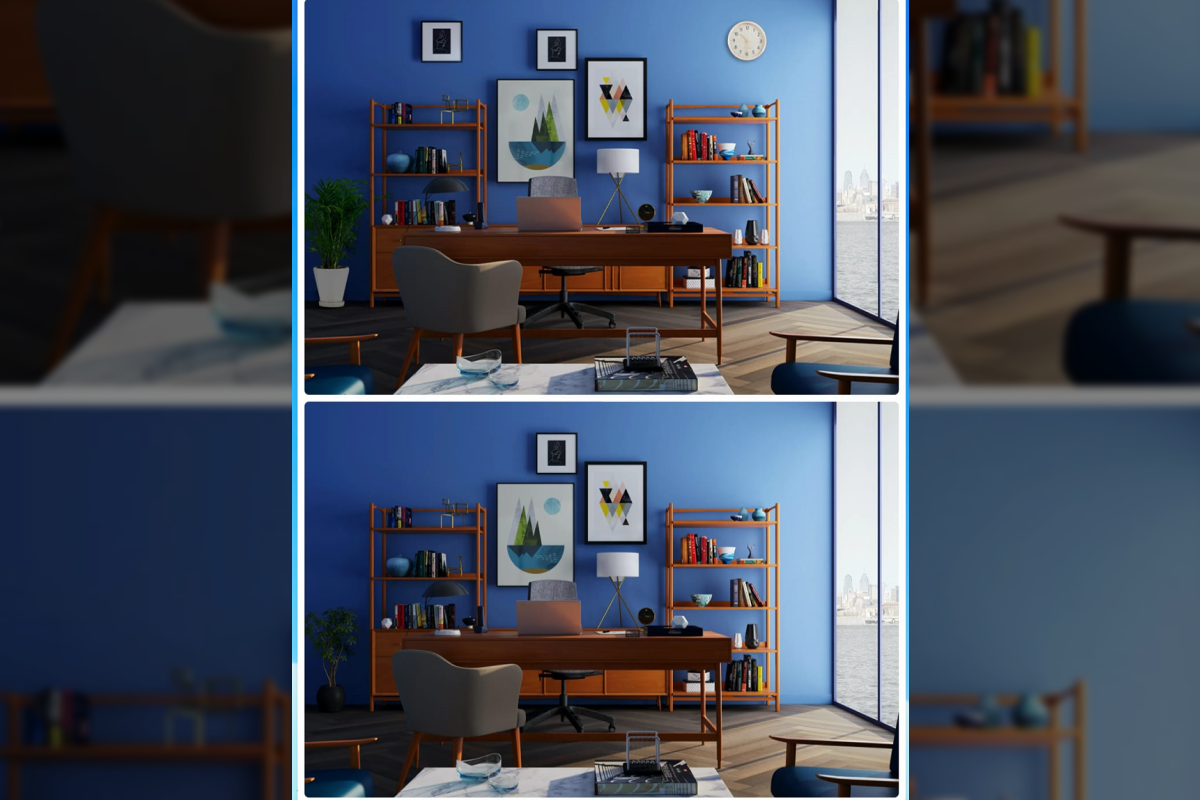 Logo que aparecer, você vai ver a imagem de um escritório organizado que aparenta ser igual nas duas repetições que vimos dele. No entanto, o enunciado nos leva a crer que algumas diferenças podem ser vistas após analisar as duas figuras com mais cautela. Então, veja se você consegue encontrar os cinco erros do escritório agora mesmo:
