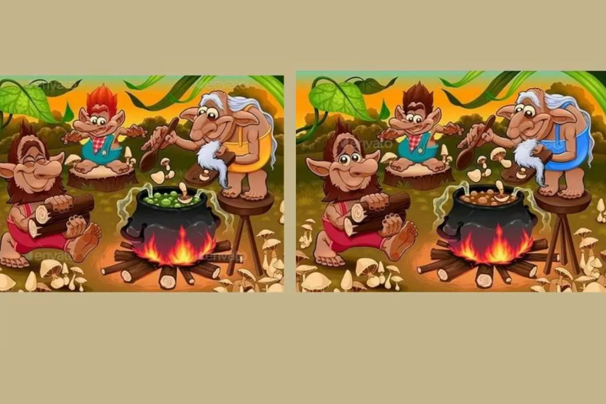 A imagem abaixo mostra duas cenas lado a lado, que parecem quase idênticas à primeira vista, mas contêm seis diferenças ocultas. Na imagem, vemos três personagens, possivelmente elfos ou duendes, ao redor de uma fogueira. Um deles está adicionando ingredientes em um caldeirão sobre o fogo, enquanto outro está sentado em um tronco de madeira, segurando lenha, e o terceiro está sentado no chão com uma expressão alegre.