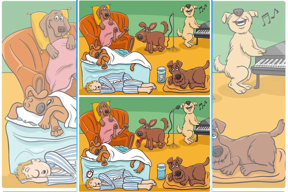 Aqui, você verá duas imagens aparentemente iguais que retratam alguns cachorros na cena que é muito divertida. Na figura você pode ver animais tocando piano e outros que colocaram o próprio dono da casa no chão para dormir sobre o colchão. No entanto, será que você consegue perceber que existem diferenças entre as duas figuras apesar de todas as semelhanças que podem ser vistas entre elas? Para isso, você precisa provar que é muito focado e que nada passa despercebido quando você tenta resolver esse tipo de atividade. Vamos então conferir a imagem agora mesmo para você sse testar.