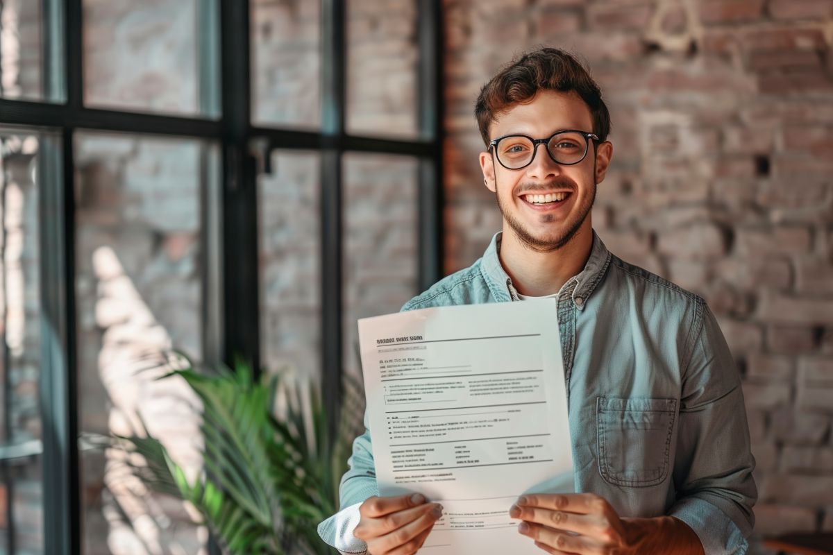 Homem sorrindo ao segurar seu currículo.