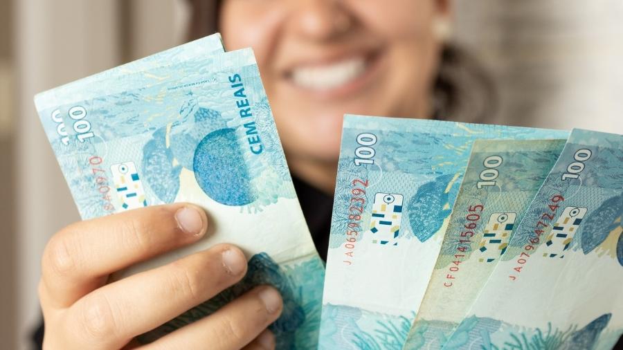 Imagem de uma mulher com laptop e cédulas de 100 reais, simbolizando o reajuste do salário mínimo em 2026