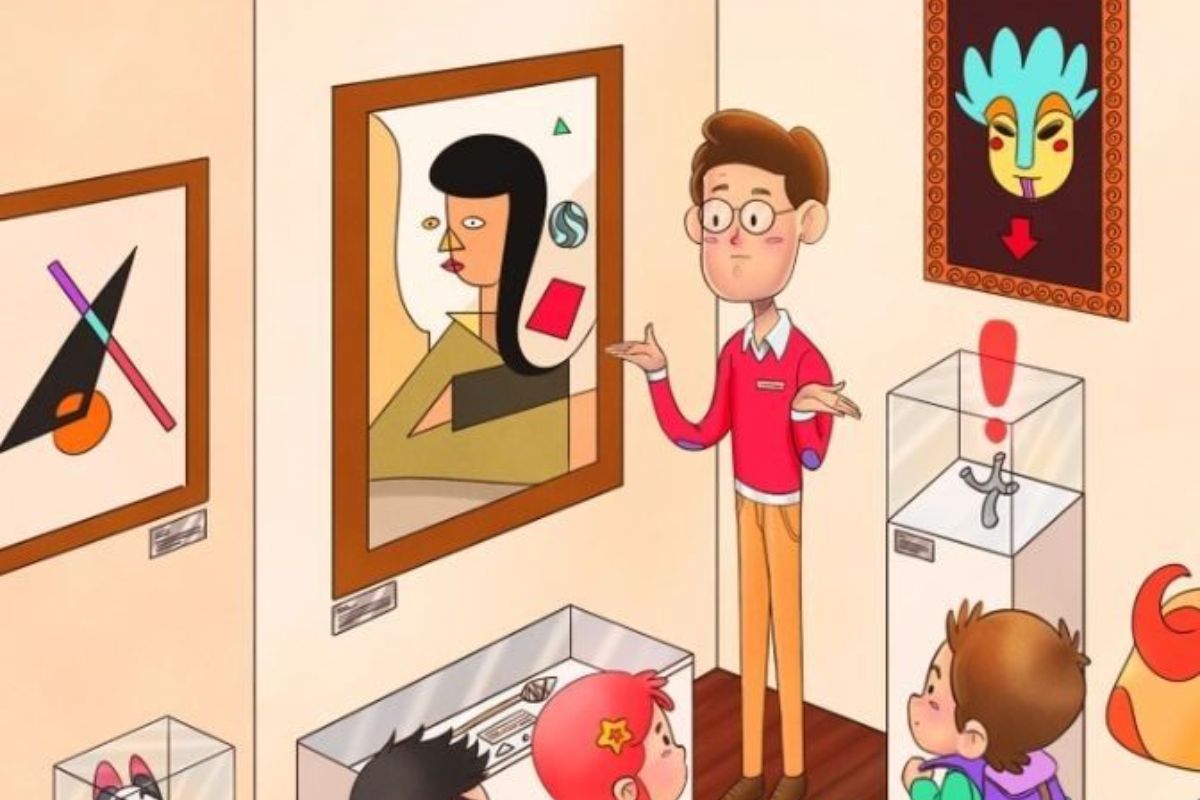 Na imagem, observamos um cenário de museu onde um grupo de crianças, guiadas por um curador, explora uma exposição de arte. As paredes estão adornadas com quadros de diferentes estilos e cores vibrantes. No centro da imagem, o curador, com uma expressão de incerteza, parece explicar algo aos jovens visitantes, que estão atentos e curiosos. Uma das vitrines contém um ponto de exclamação vermelho, destacando a ausência de um objeto.