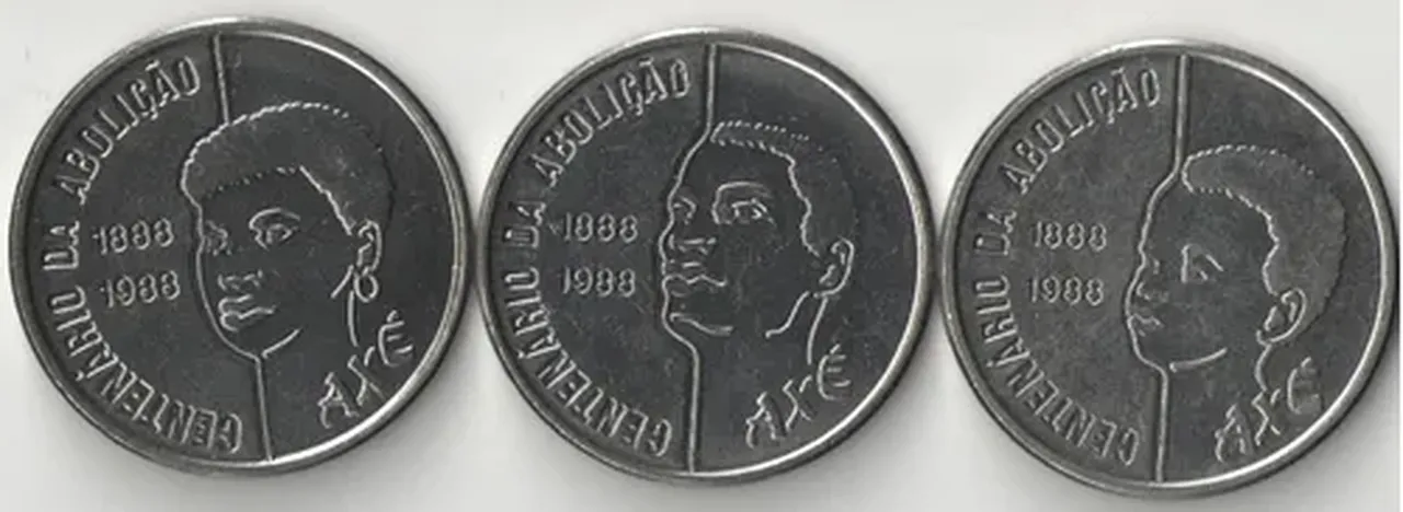 São três moedas com cunhagem diferente da série comemorativa aos 100 anos da abolição da escravatura (1888 a 1988).