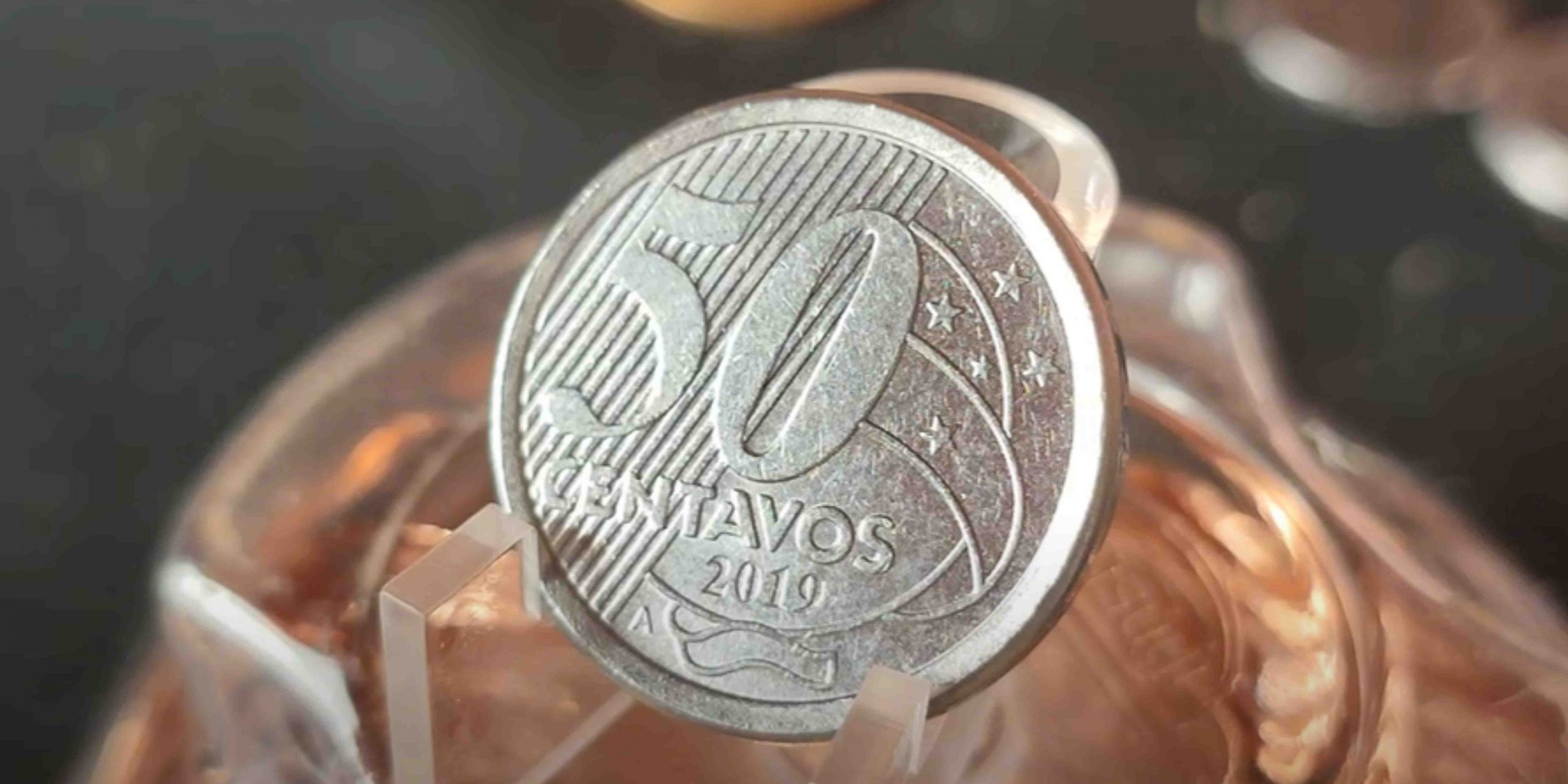 A moeda de 50 centavos do ano de 2019 só adquire status de rara quando apresenta um pequeno defeito de cunhagem, caracterizado pela inscrição da letra “A” em seu reverso, localizada ao lado da bandeira na parte inferior da moeda.
