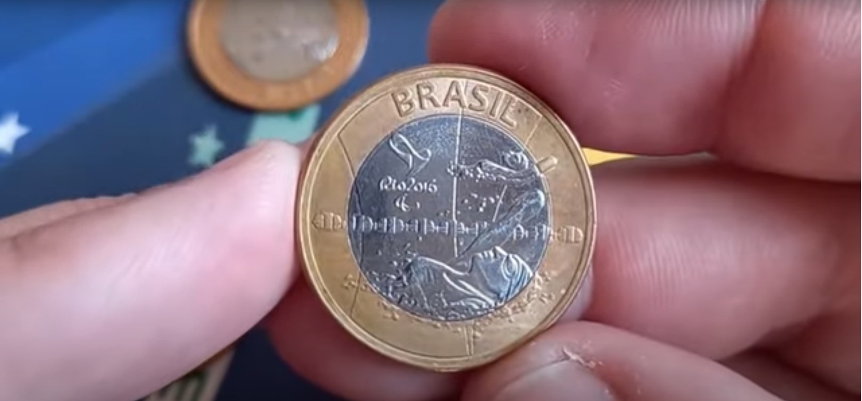 O valor de uma moeda de natação pode chegar a valer até R$ 500. Esta moeda possui um erro de cunhagem, chamado de reverso invertido 180º.
