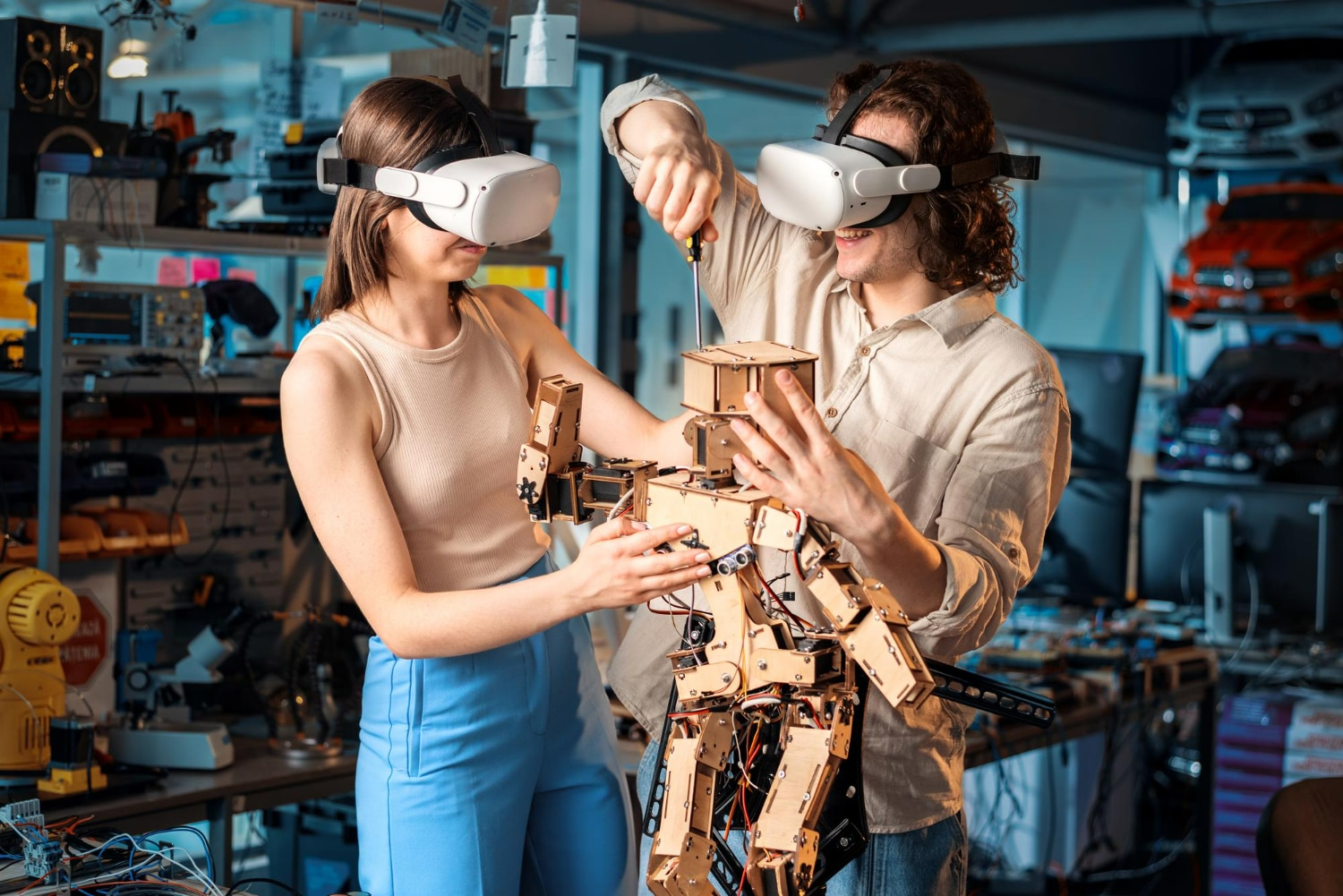 Dois jovens usando óculos de realidade virtual montando um robô de madeira com componentes eletrônicos em oficina tecnológica.