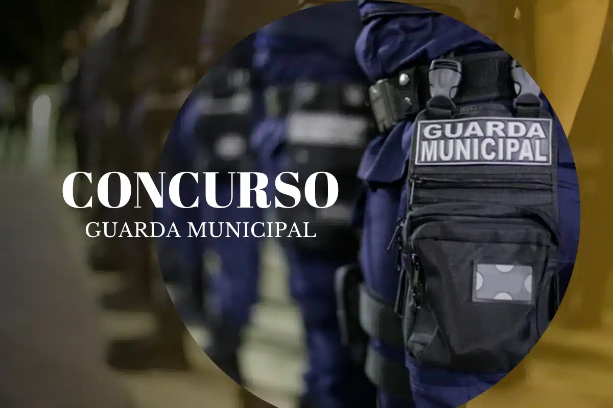 Imagem de um guarda municipal em patrulha, com o texto 'CONCURSO GUARDA MUNICIPAL' sobreposto.