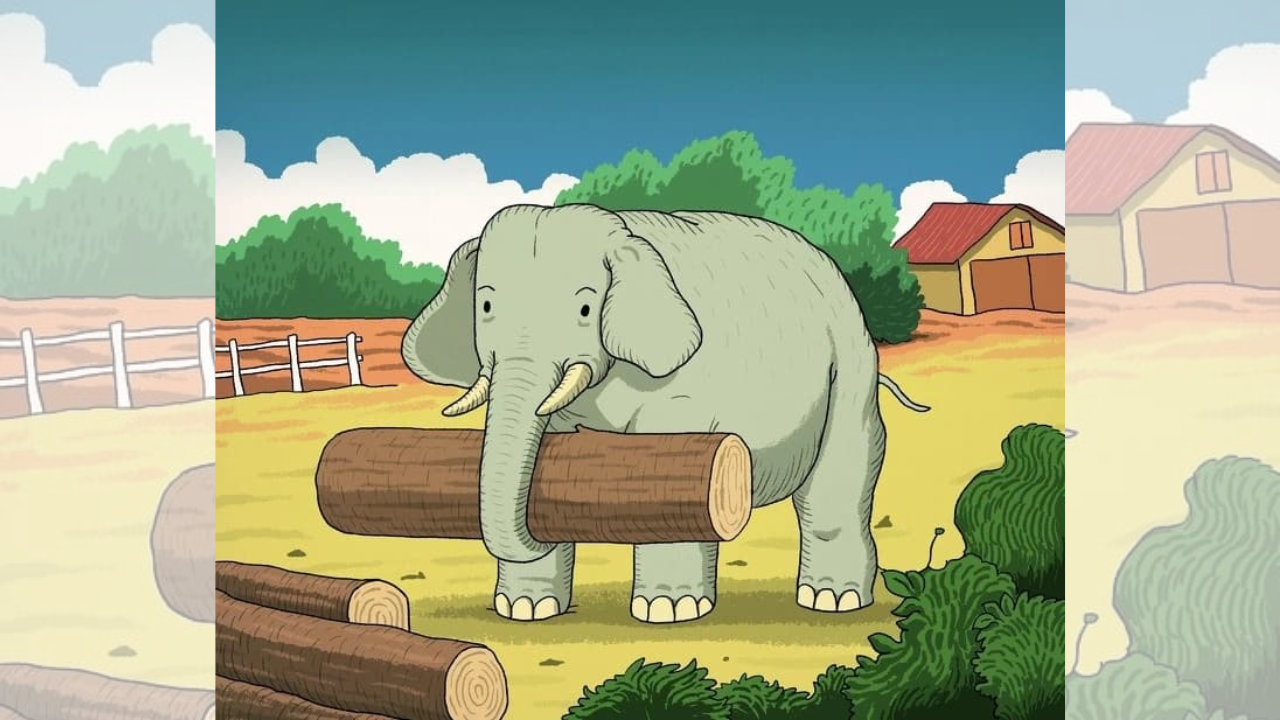 A imagem apresenta uma cena típica de vila, com um elefante chamando a atenção ao carregar um pesado tronco. No entanto, nosso foco se desvia para uma tarefa mais intrigante: há um cavalo escondido na imagem, esperando ser descoberto por olhos observadores.
