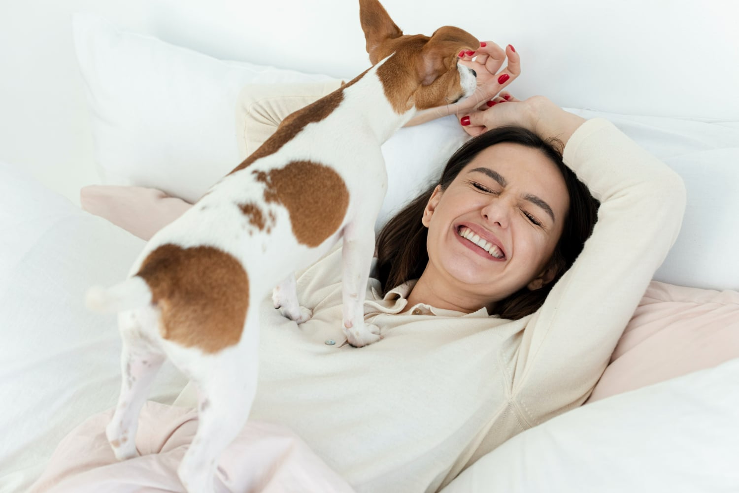 Mulher sorrindo feliz enquanto interage com seu cachorro de estimação em um momento de carinho e descontração.