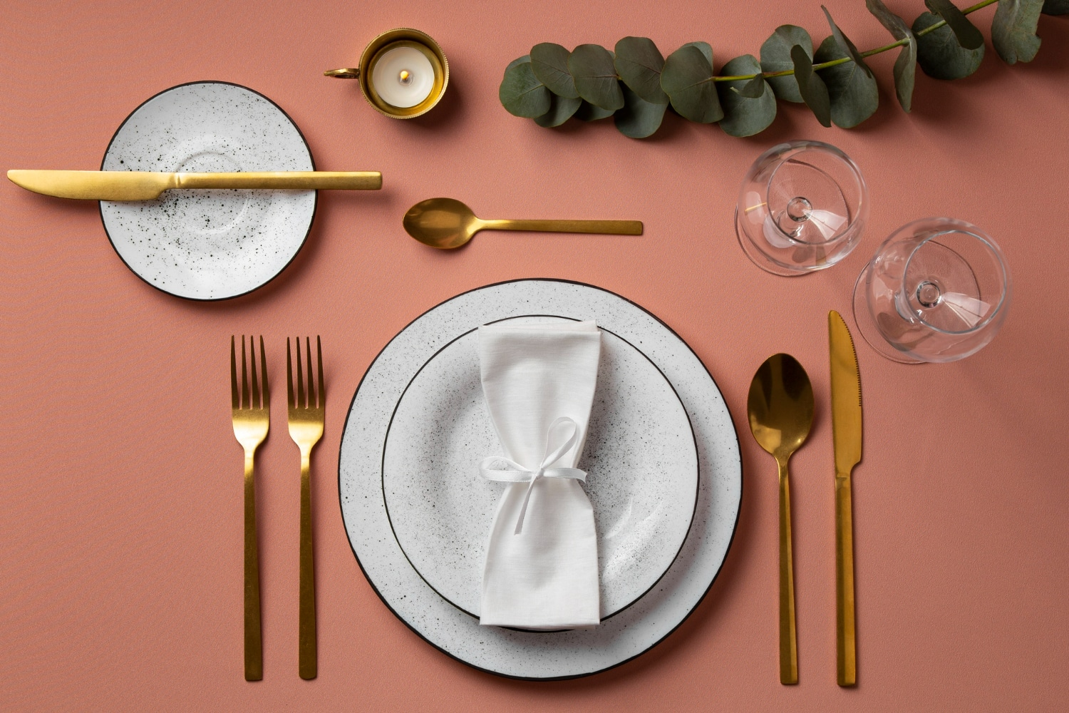 Mesa arrumada sofisticada com talheres dourados, pratos brancos e decoração minimalista.