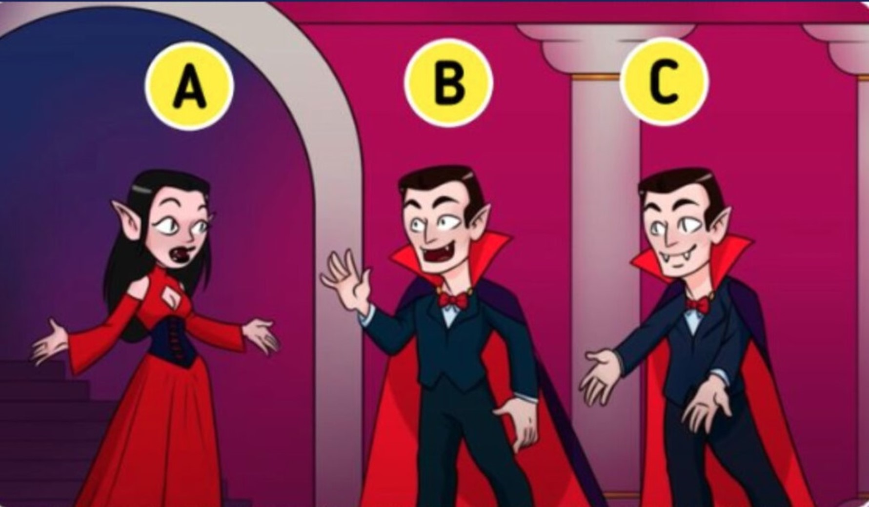E aí, conseguiu encontrar o vampiro impostos na imagem acima? Temos os vampiros A, B e C. No total, 2 deles são legítimos seres das trevas que se alimentam de sangue. Mas um deles é apenas um humano fantasiado.