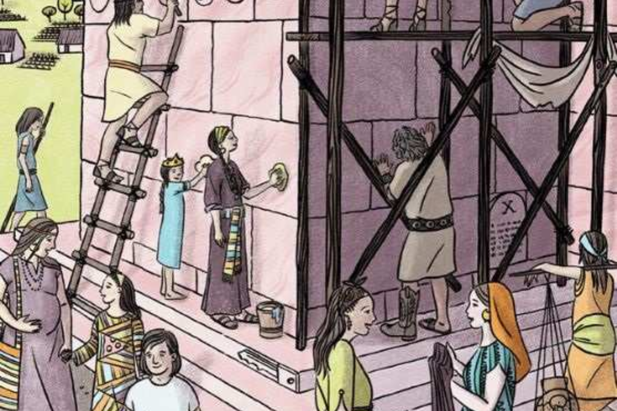 Na imagem, vemos uma cena detalhada de construção de um templo antigo. Várias pessoas estão envolvidas em diferentes atividades: algumas estão subindo escadas e esculpindo as paredes, enquanto outras estão conversando ou cuidando de ovelhas. A arquitetura do templo é composta por grandes blocos de pedra rosa, e há andaimes de madeira em um dos cantos.