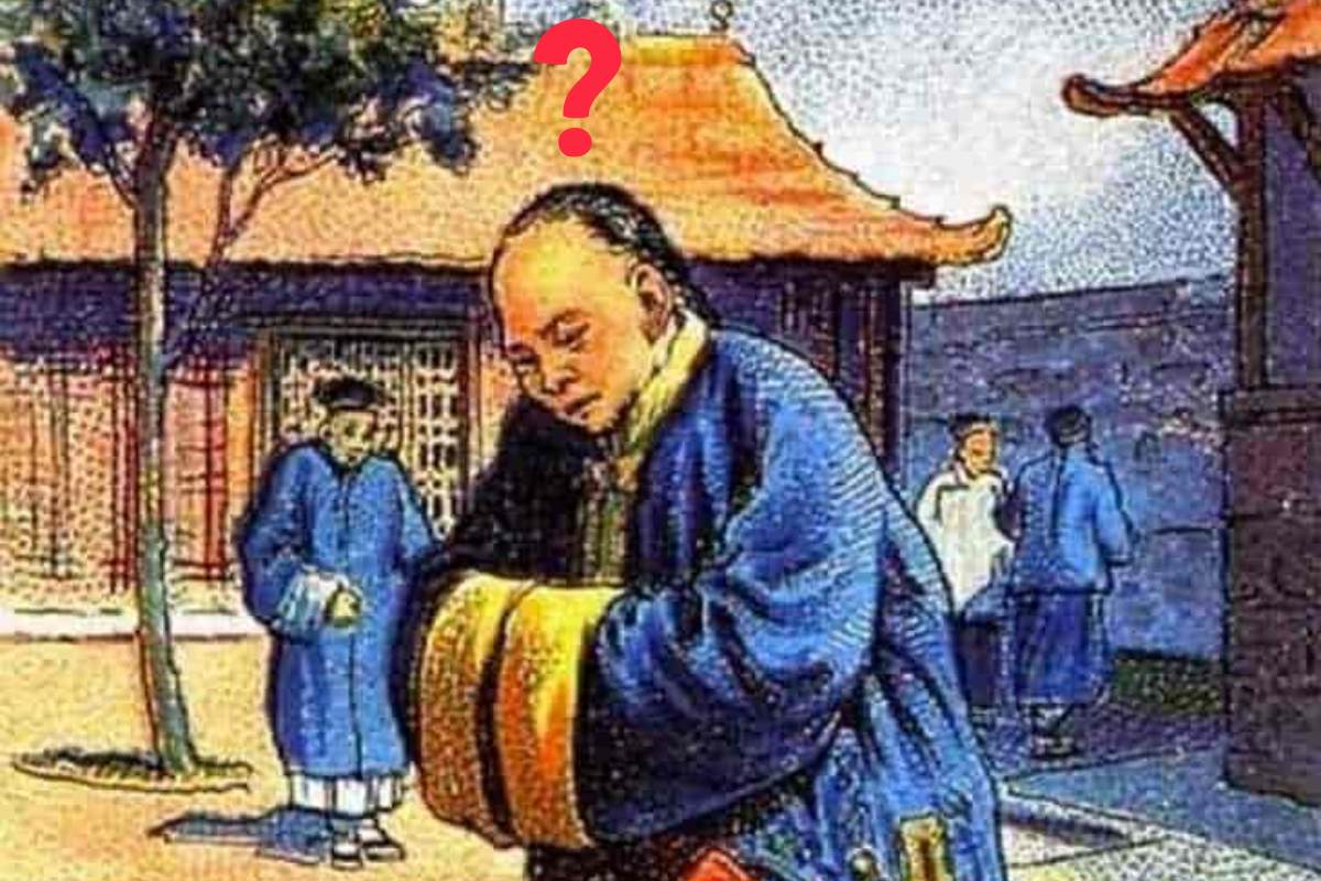 A paisagem parece ser um pátio de um templo ou uma residência nobre, com piso de pedras e uma atmosfera tranquila. A iluminação da cena sugere um clima de fim de tarde ou início da manhã, com sombras suaves indicando uma luz solar difusa.
