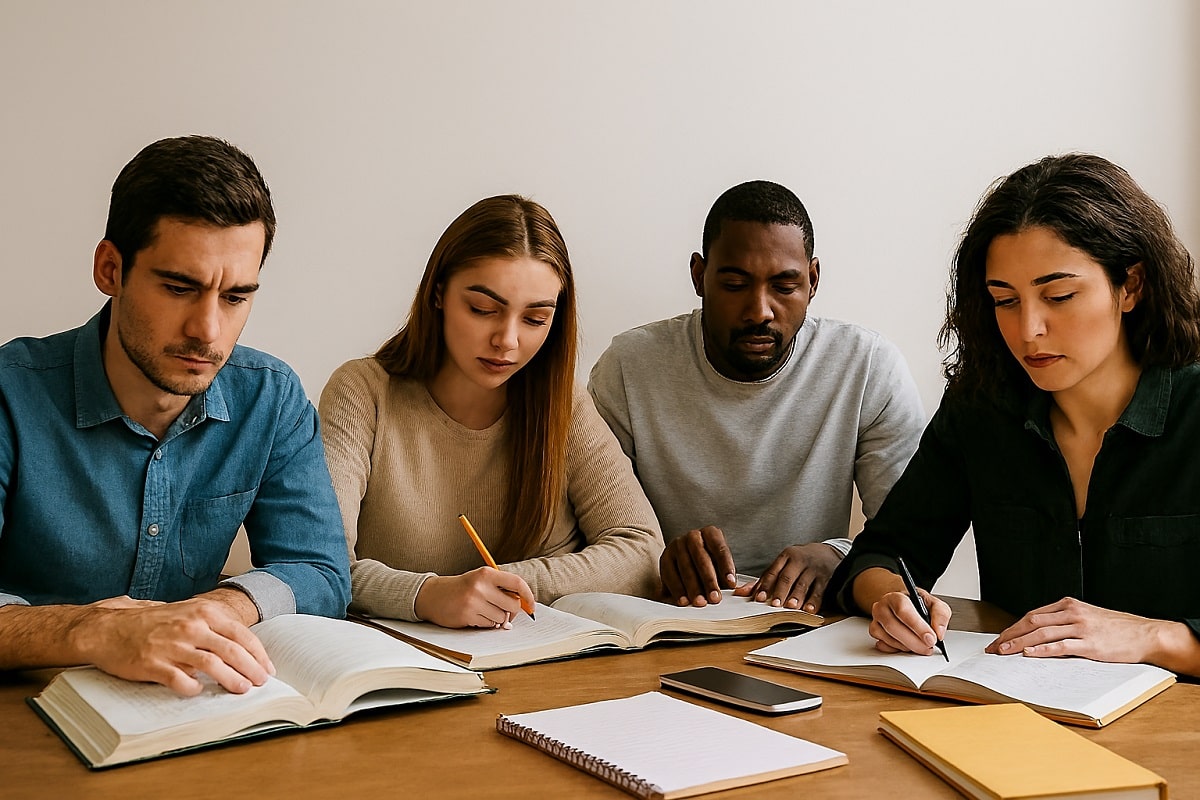 uatro jovens concentrados estudando em uma mesa com livros e cadernos.
