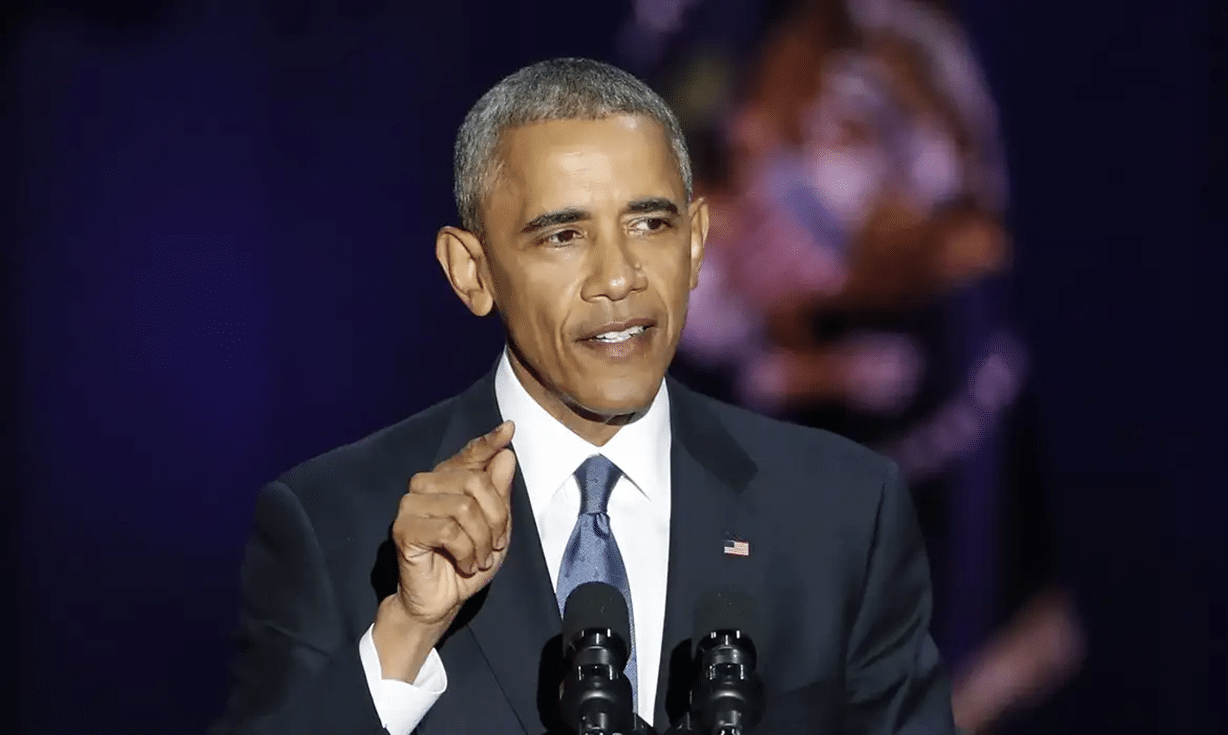 Barack Obama discursando, um dos presidentes mais inteligentes e canhotos da história dos EUA.