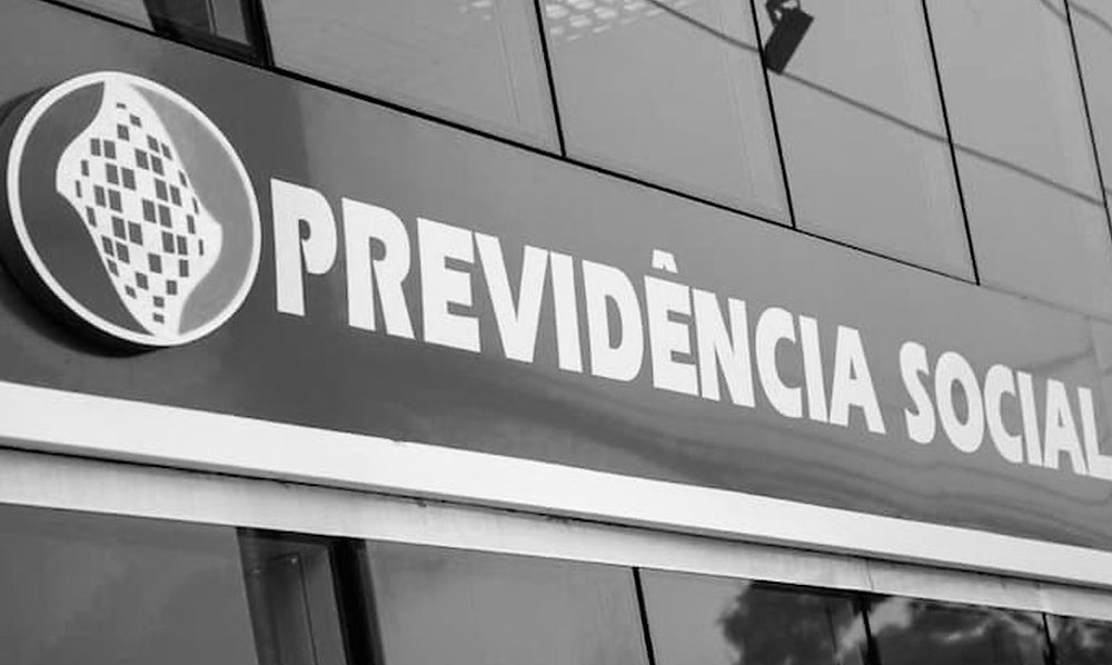 Fachada do prédio da Previdência Social com notas de dinheiro brasileiras ao fundo.