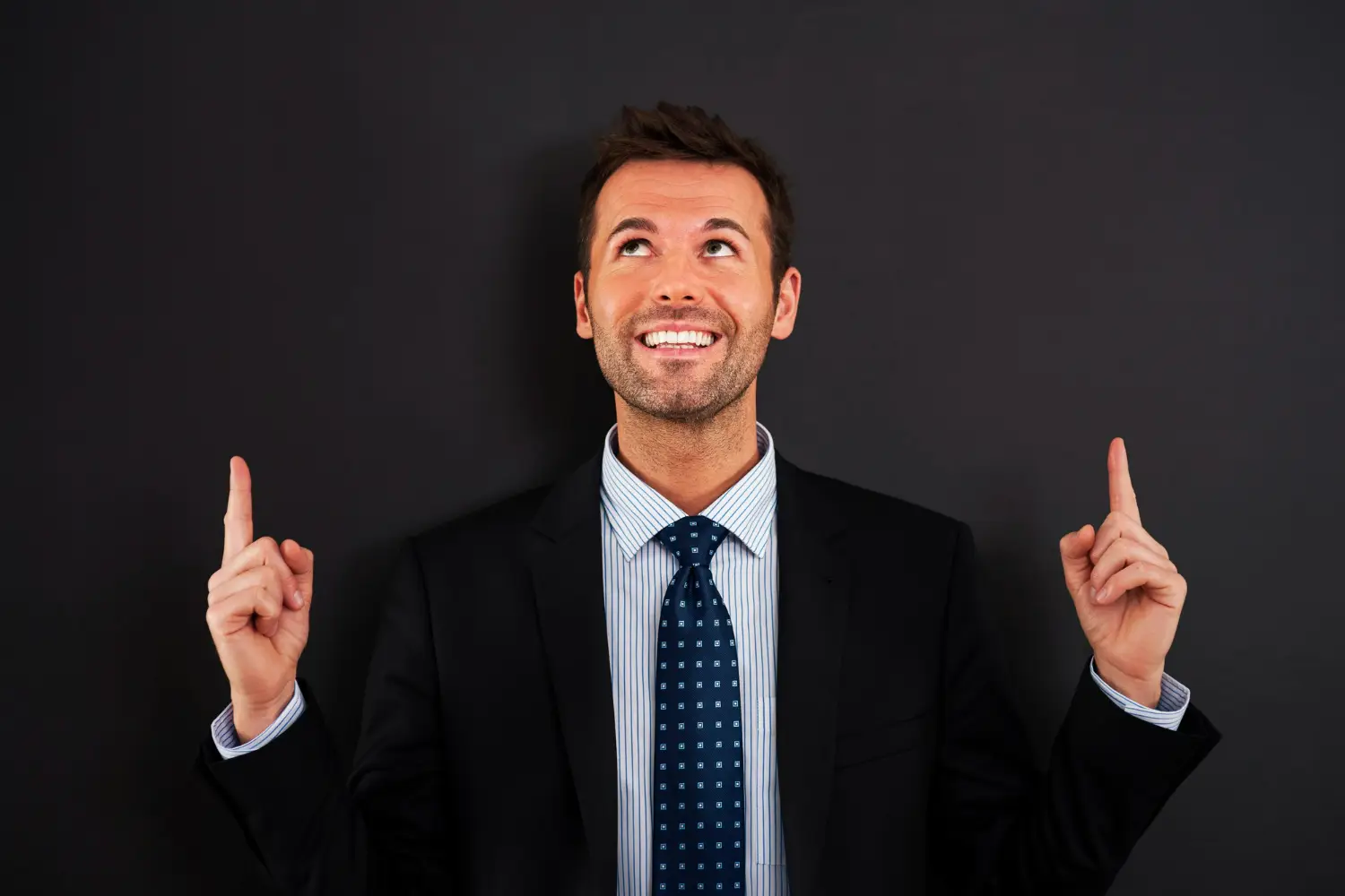 Homem de terno sorrindo e apontando para cima, demonstrando confiança e otimismo.