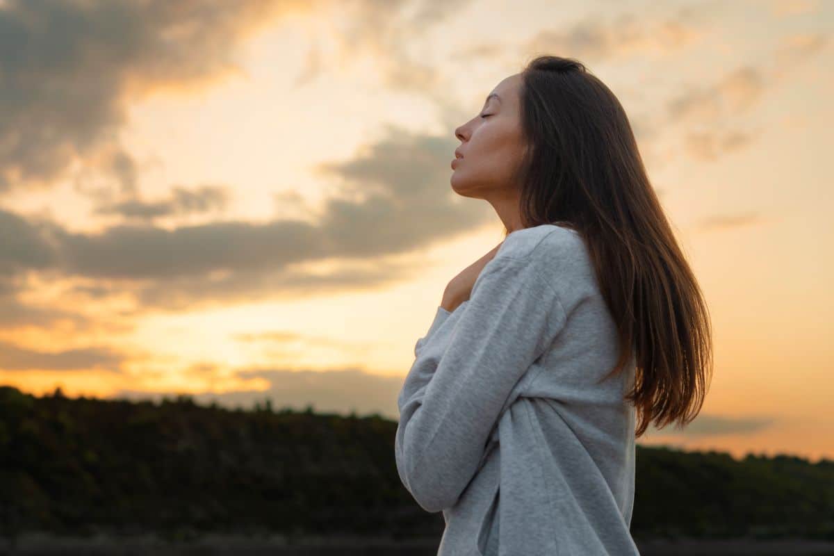 Mulher de perfil, com olhos fechados, desfrutando do ar fresco e do pôr do sol ao fundo, simbolizando introspecção e força mental.