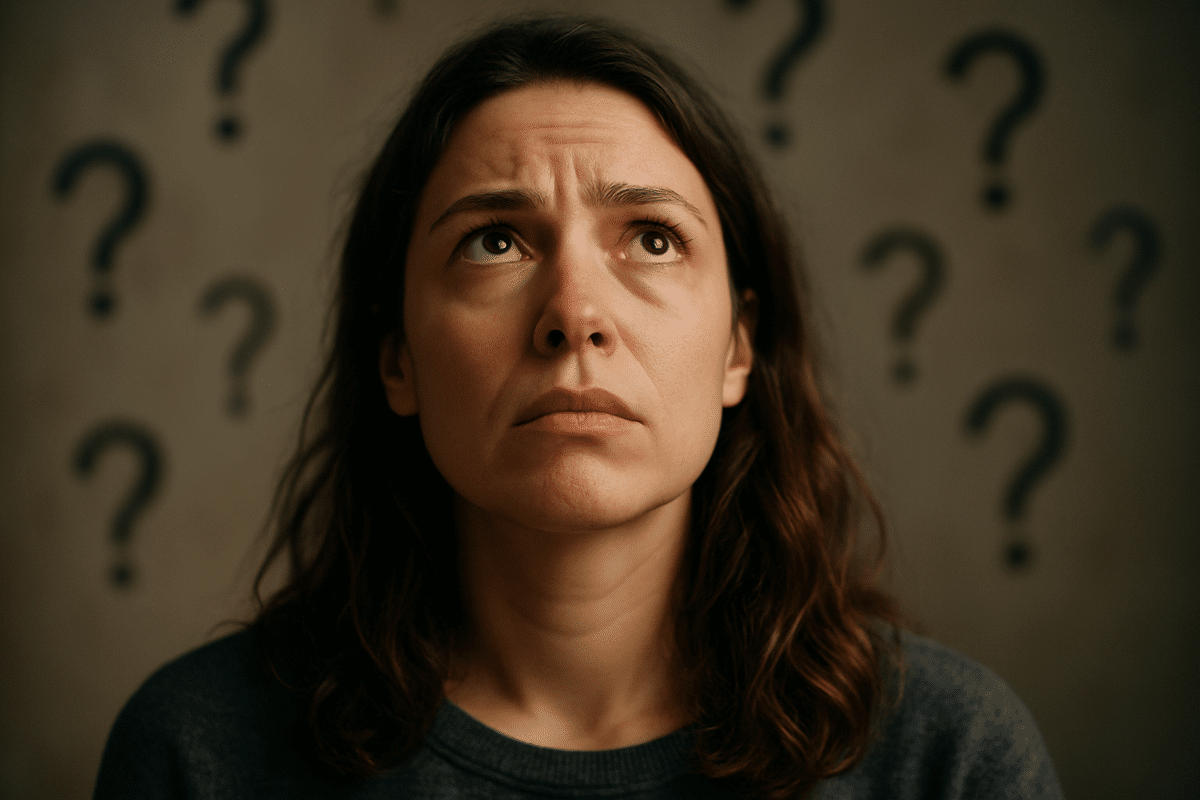 Mulher com expressão de dúvida, simbolizando a confusão sobre as diferentes formas do uso de "porque".