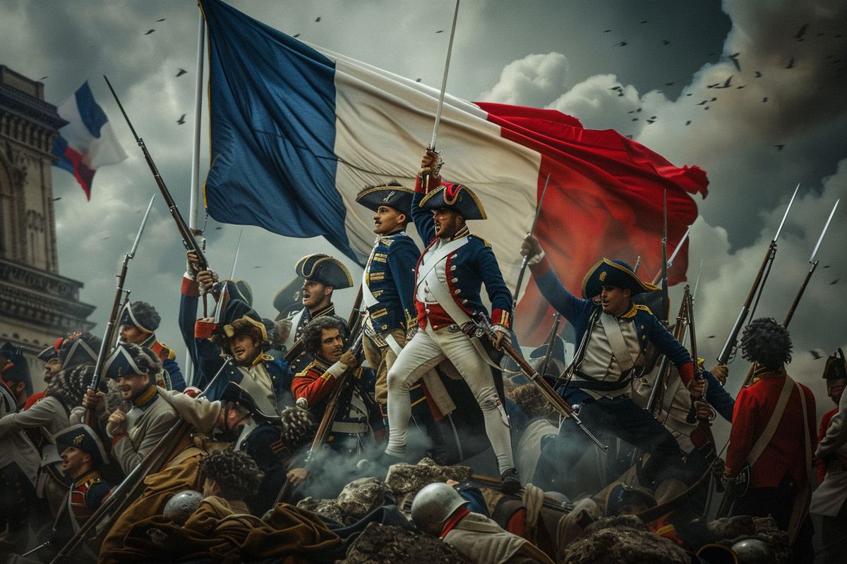 "Revolução Francesa: Cena de batalha com soldados franceses erguendo a bandeira da França durante a Revolução, simbolizando a luta contra o regime monárquico.