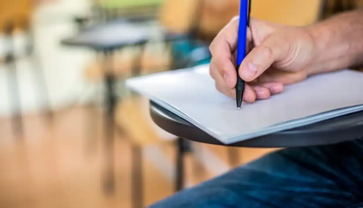 Pessoa escrevendo em um papel durante um processo seletivo, com ênfase na mão segurando uma caneta.