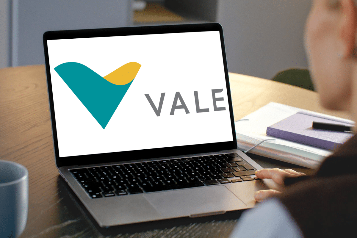 Pessoa olhando para o logo da Vale exibido em um notebook aberto sobre a mesa