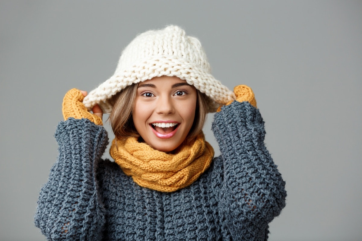 Mulher feliz usando roupas de inverno, incluindo suéter, cachecol e chapéu de tricô, representando a preferência pelo frio.