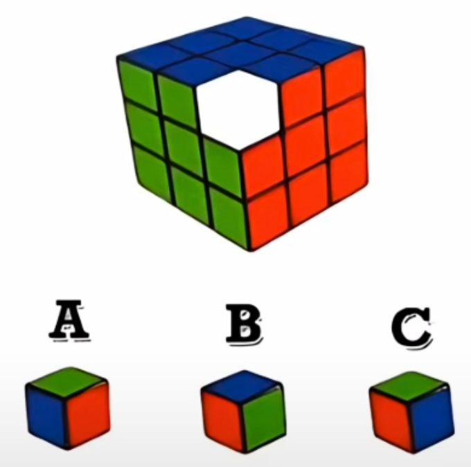 A imagem mostra um cubo mágico com uma peça faltando no canto superior esquerdo. Abaixo do cubo, há três opções de peças que podem preencher o espaço vazio. As opções estão marcadas como A, B e C, cada uma com uma combinação diferente de cores nas faces visíveis. O objetivo é identificar qual das três peças se encaixa corretamente no cubo mágico.