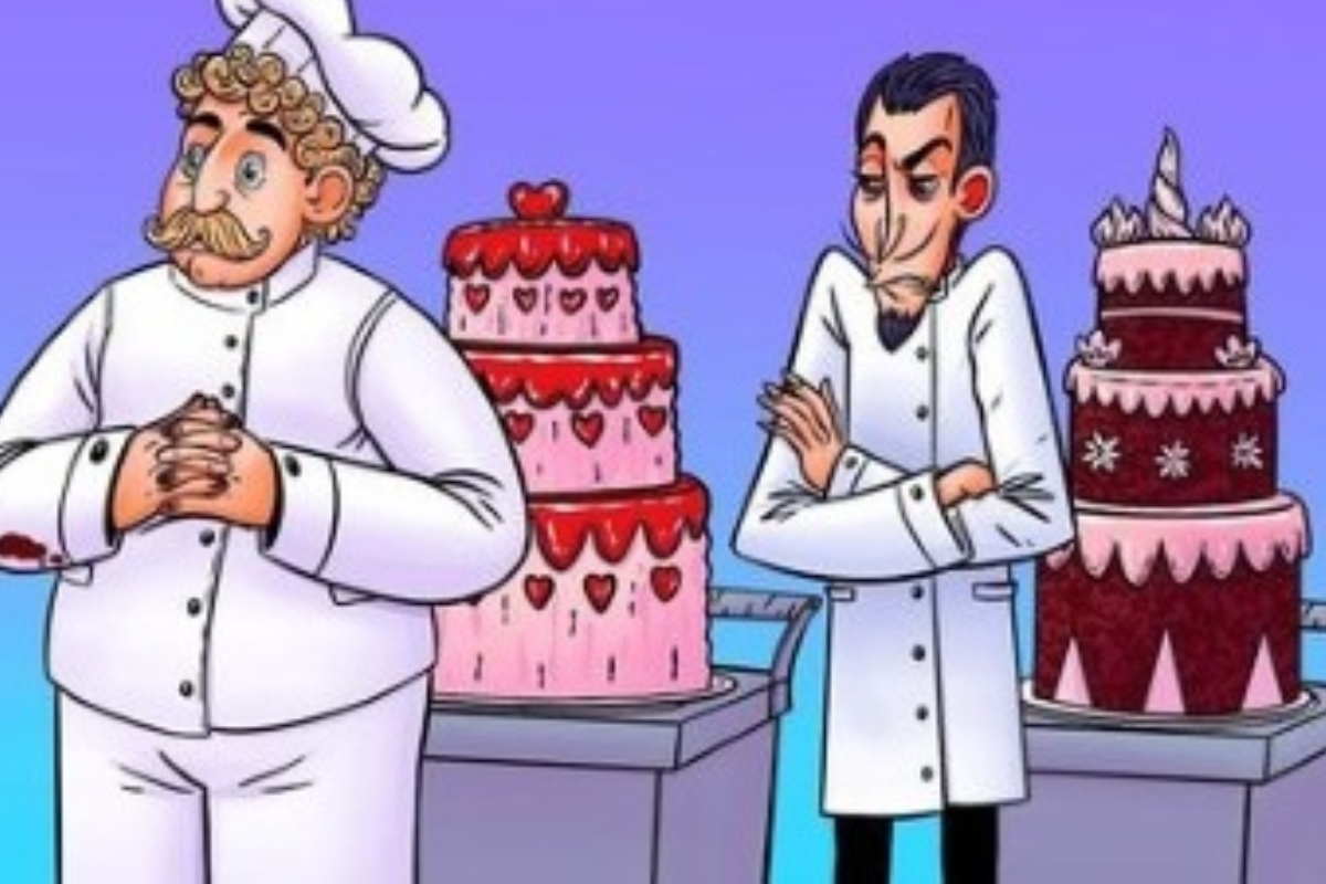À direita, o segundo padeiro apresenta uma aparência mais séria e talvez suspeita. Ele é magro, tem cabelos escuros e uma expressão fechada. Suas sobrancelhas estão arqueadas, sugerindo um ar de desconfiança ou frustração. Atrás dele, está um bolo maior, em tons de vermelho e preto, com uma decoração mais sombria e detalhada, com estrelas e padrões que contrastam com o bolo ao lado.
