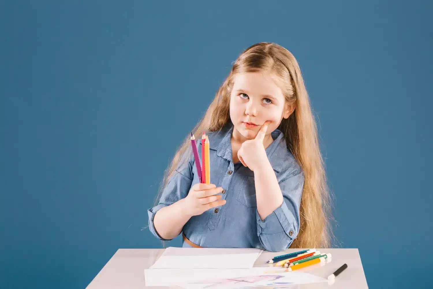 Menina com cabelo longo, segurando lápis coloridos e pensando, refletindo sobre o plural de lápis.