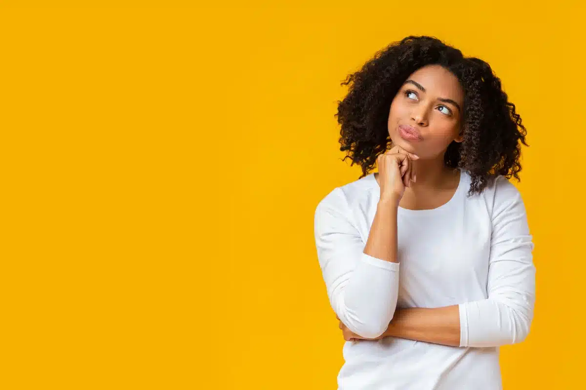Mulher pensativa com fundo amarelo, refletindo sobre o plural da palavra 'gravidez'.
