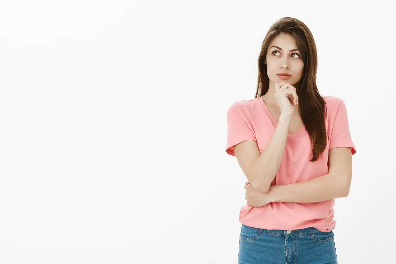 Mulher pensativa com camiseta rosa, olhando para o lado, sobre fundo branco.