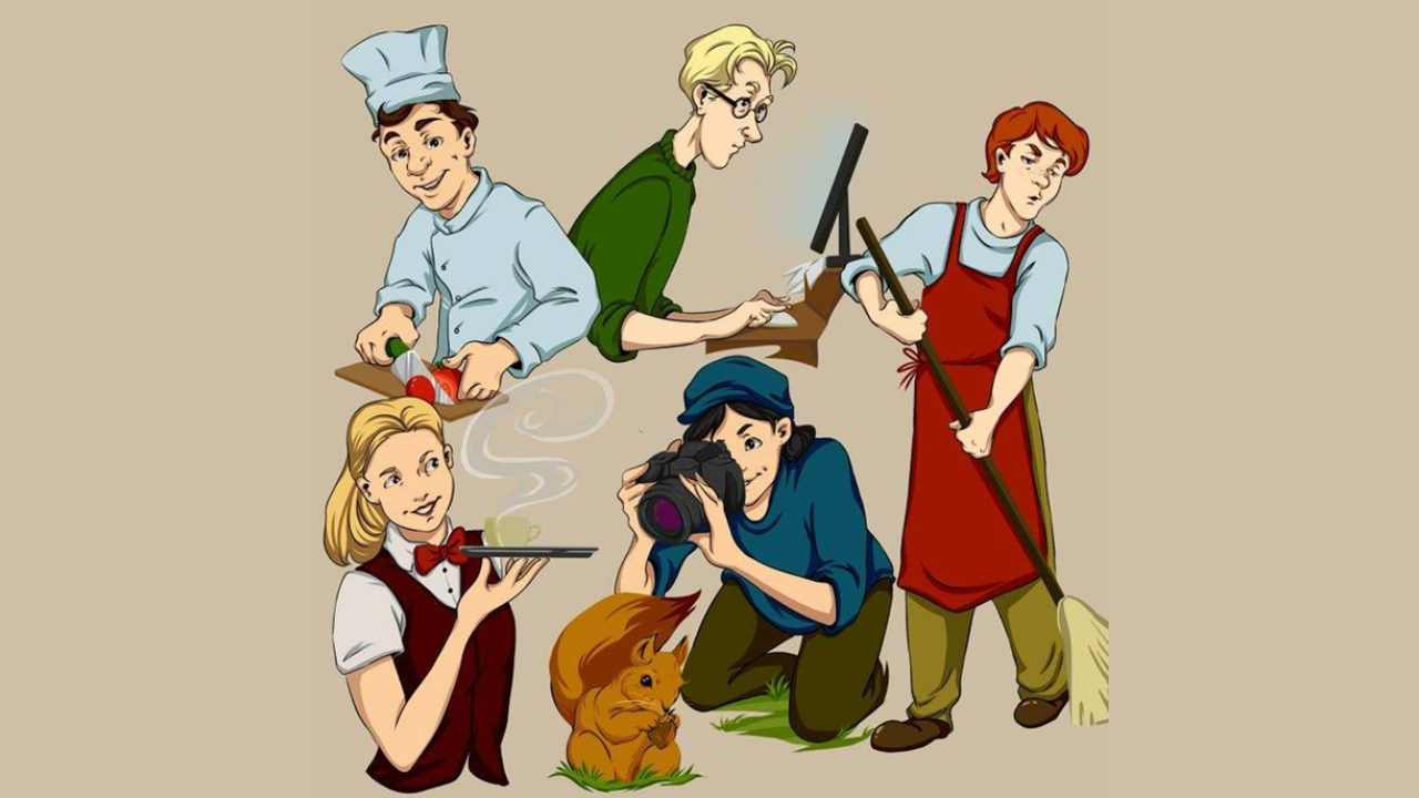 Nossa imagem apresenta seis personagens, cada um ocupado com uma atividade distinta. A missão é simples: identifique quem, dentre eles, é canhoto em apenas 21 segundos.