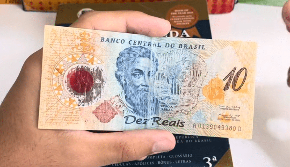 Lançada em 2000 para celebrar os 500 anos do descobrimento do Brasil, a cédula de 10 reais feita de polímero se destaca pelo material “plástico”, diferente do papel tradicional. A figura de Pedro Álvares Cabral ilustra seu anverso, e seu design ainda inclui área transparente, marca d’água autêntica, mapas históricos e símbolos da pluralidade do povo brasileiro.