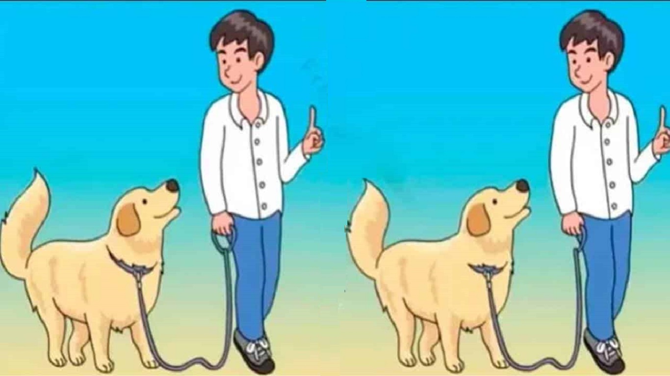 Agora vamos para resolução do teste de raciocínio lógico, na imagem abaixo você irá encontrar onde está localizado as 3 DIFERENÇAS na imagem representada por uma ilustração de um jovem com um cachorro em duas imagens lado a lado.