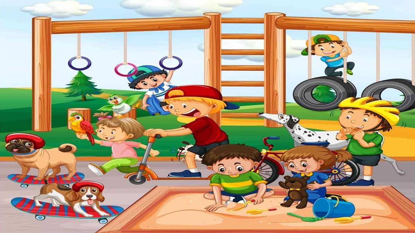 Agora vamos para resolução do teste de raciocínio lógico, na imagem abaixo você irá visualizar onde está localizado as DOZE DIFERENÇAS na imagem representada por crianças e animais se divertindo em um parquinho, com atividades diversas.