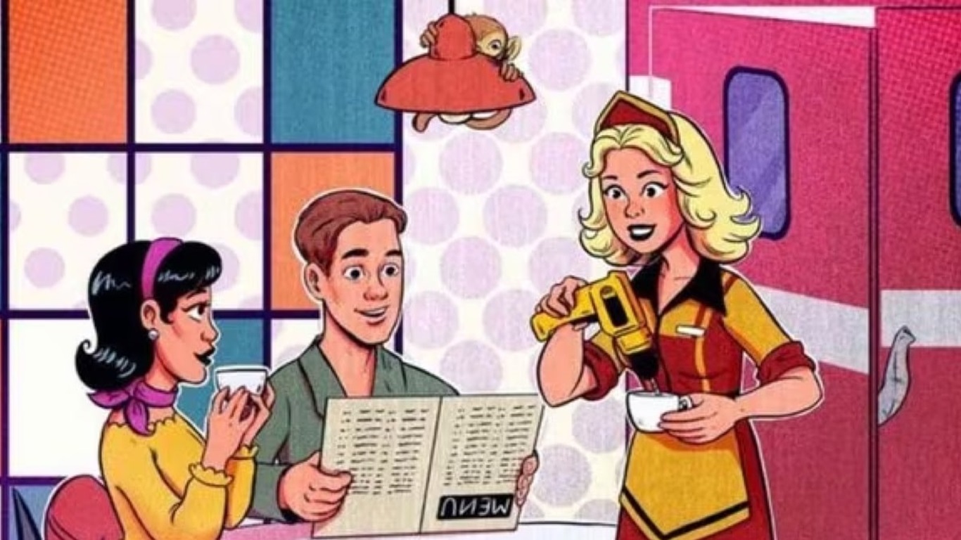 Observe as ações dos personagens: Veja se a garçonete ou o casal estão fazendo algo que não se encaixa na situação ou parece improvável.
