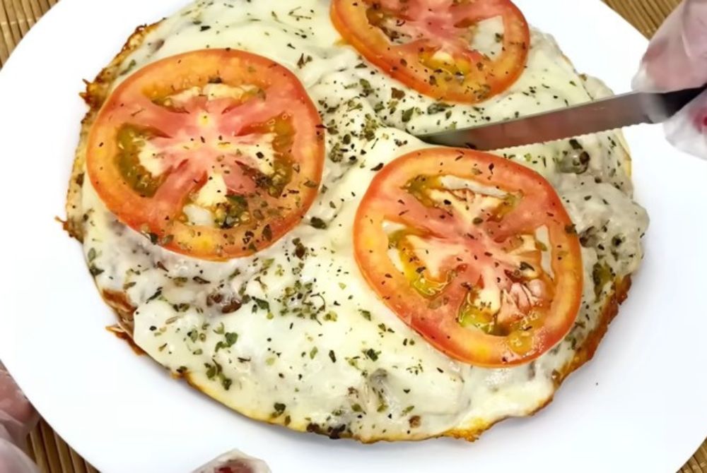 Em caso afirmativo, vire e coloque o recheio. Primeiro o molho, depois a proteína – pode ser atum, frango ou carne moída -, agora o queijo e por fim as rodelas de tomate. Se quiser, salpique orégano por cima.