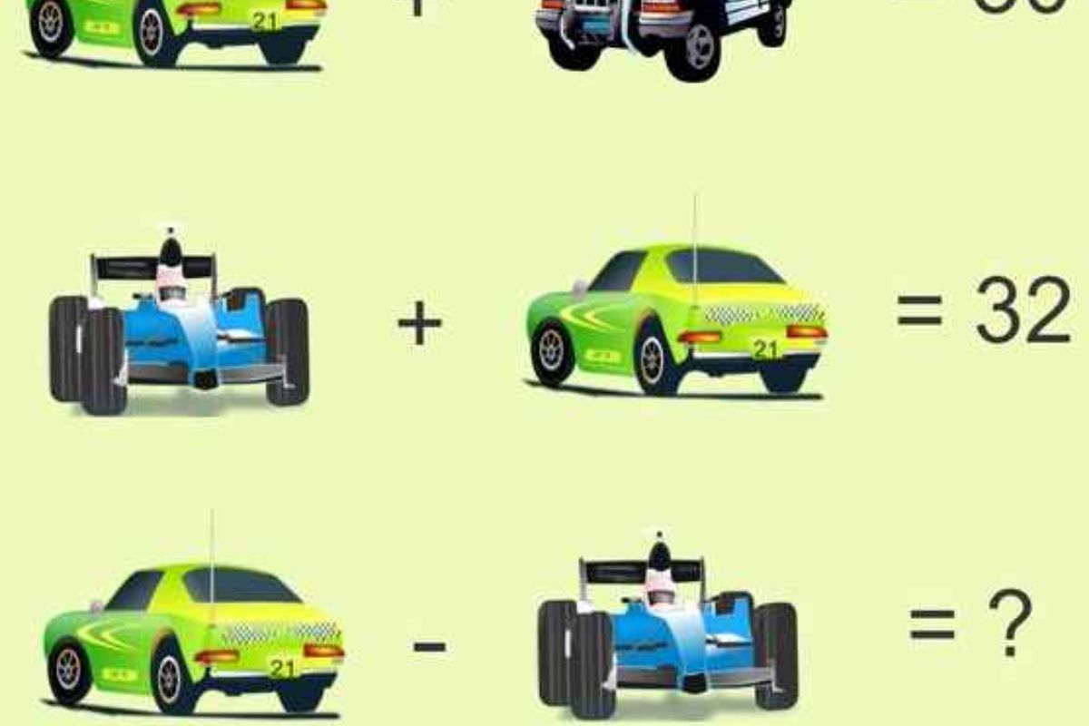 Na imagem, vemos um quebra-cabeça matemático com três tipos diferentes de carros: um carro de polícia, um carro de Fórmula 1 e um carro esportivo. As equações estão organizadas em três linhas, com a quarta linha pedindo a resolução final. As equações são as seguintes: