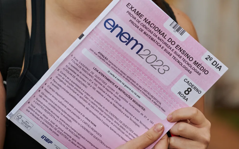 Participante segura o caderno rosa do 2º dia de provas. Imagem: Érico Andrade/ g1
