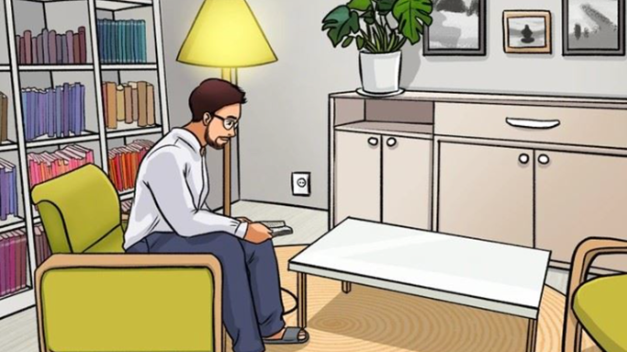 Na imagem abaixo, você se depara com uma cena comum de uma sala de estar. Um homem relaxa no sofá, imerso em sua leitura, enquanto a sala está decorada com uma estante de livros, uma lâmpada, um vaso e algumas pinturas nas paredes.