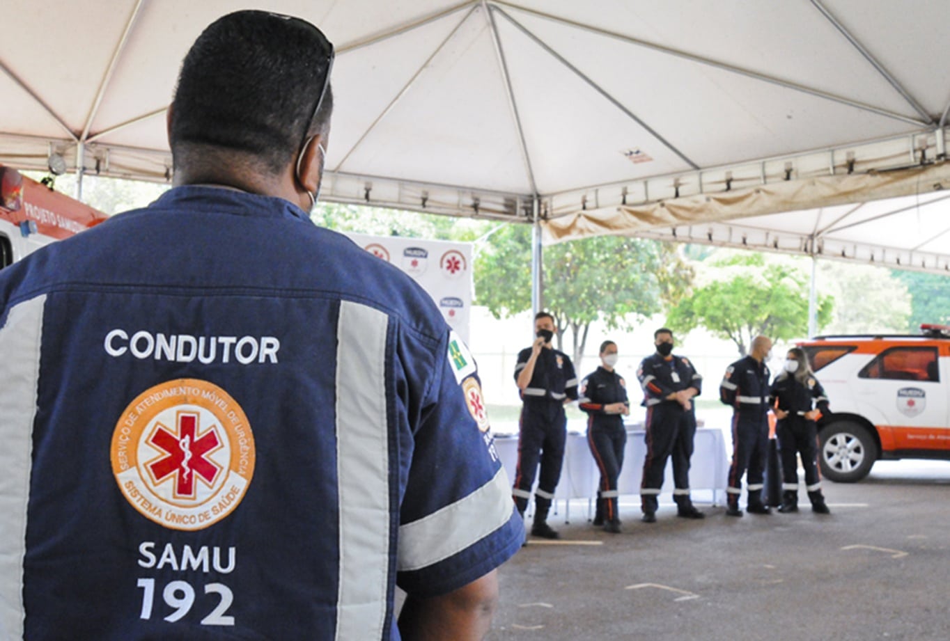 Condutor do SAMU observa equipe durante instrução de serviço.