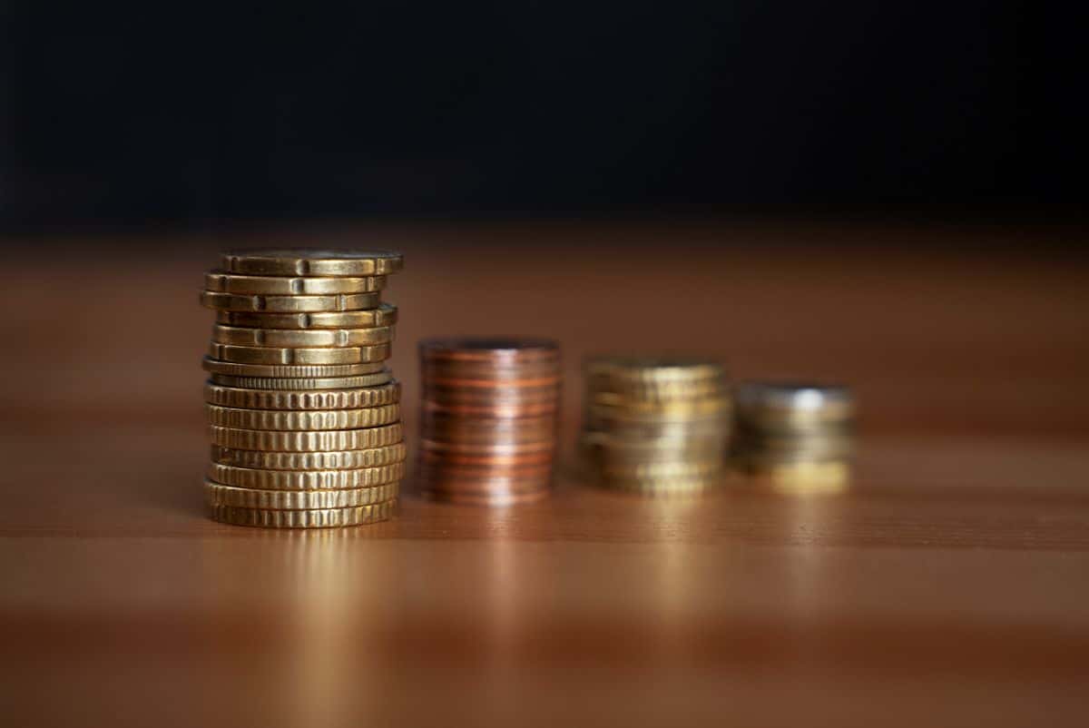 Pilhas de moedas simbolizando a economia e o acúmulo de dinheiro ao longo do tempo.