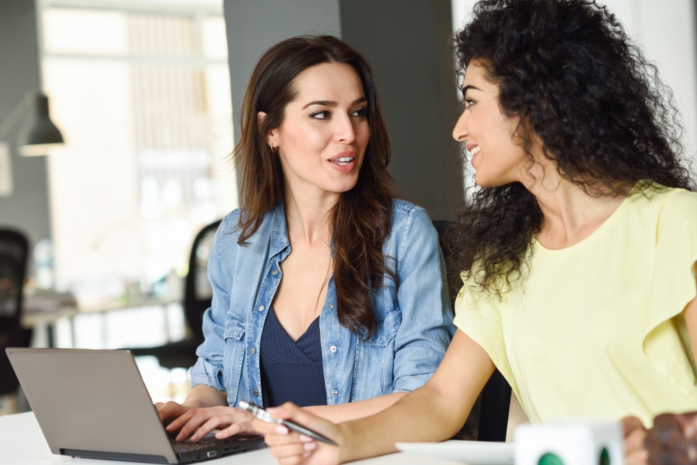Duas mulheres conversando e sorrindo em um ambiente de trabalho.