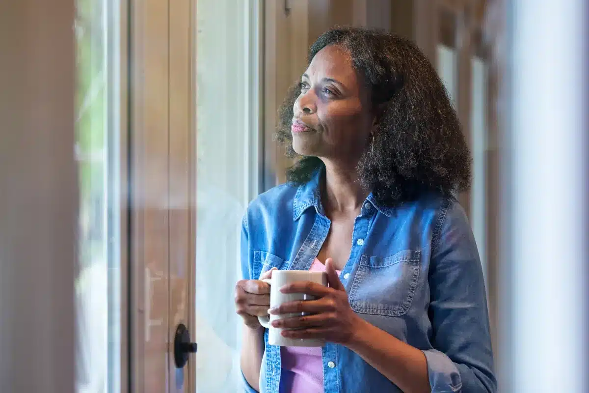 Mulher pensativa segurando uma caneca branca enquanto observa pela janela.
