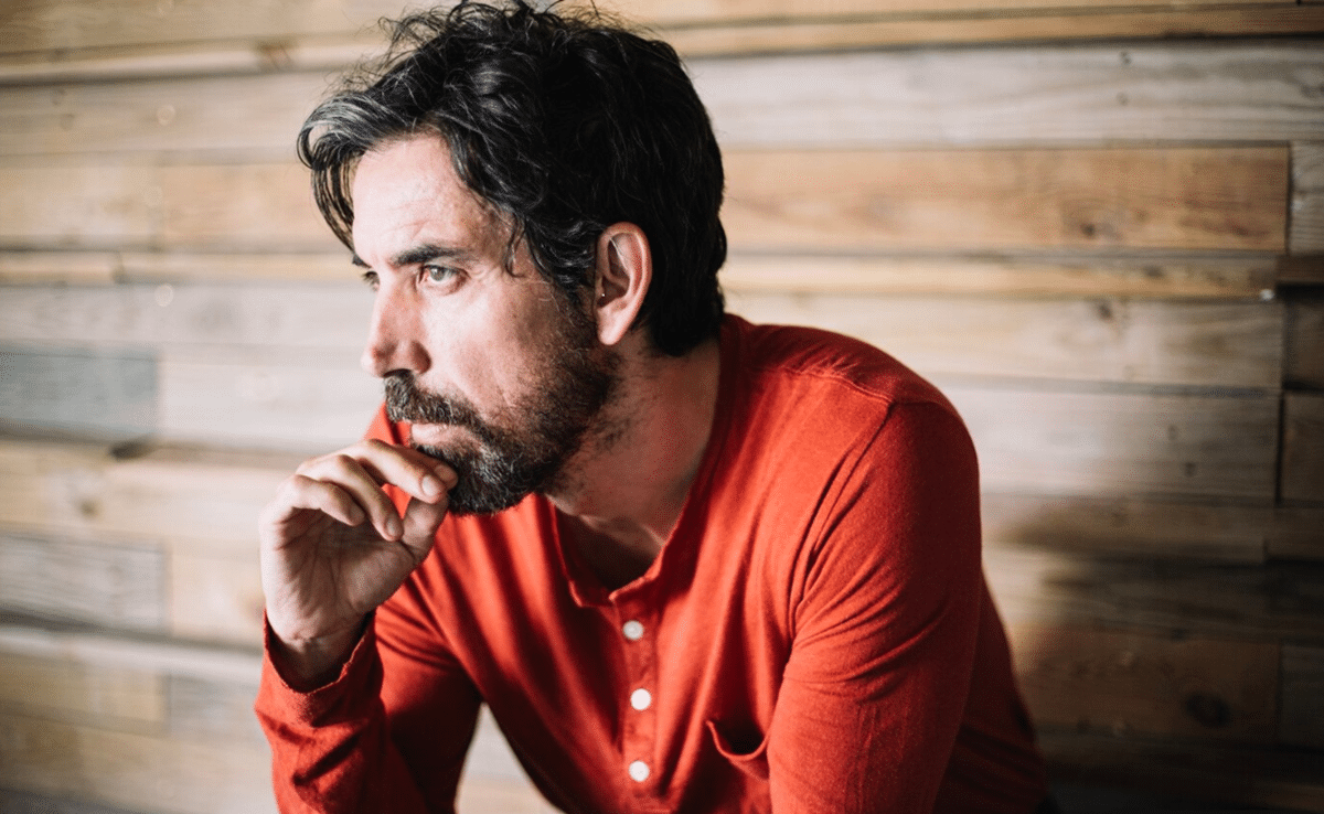 Homem pensativo refletindo sobre sua vida, com expressão séria, simbolizando a busca por paz interior