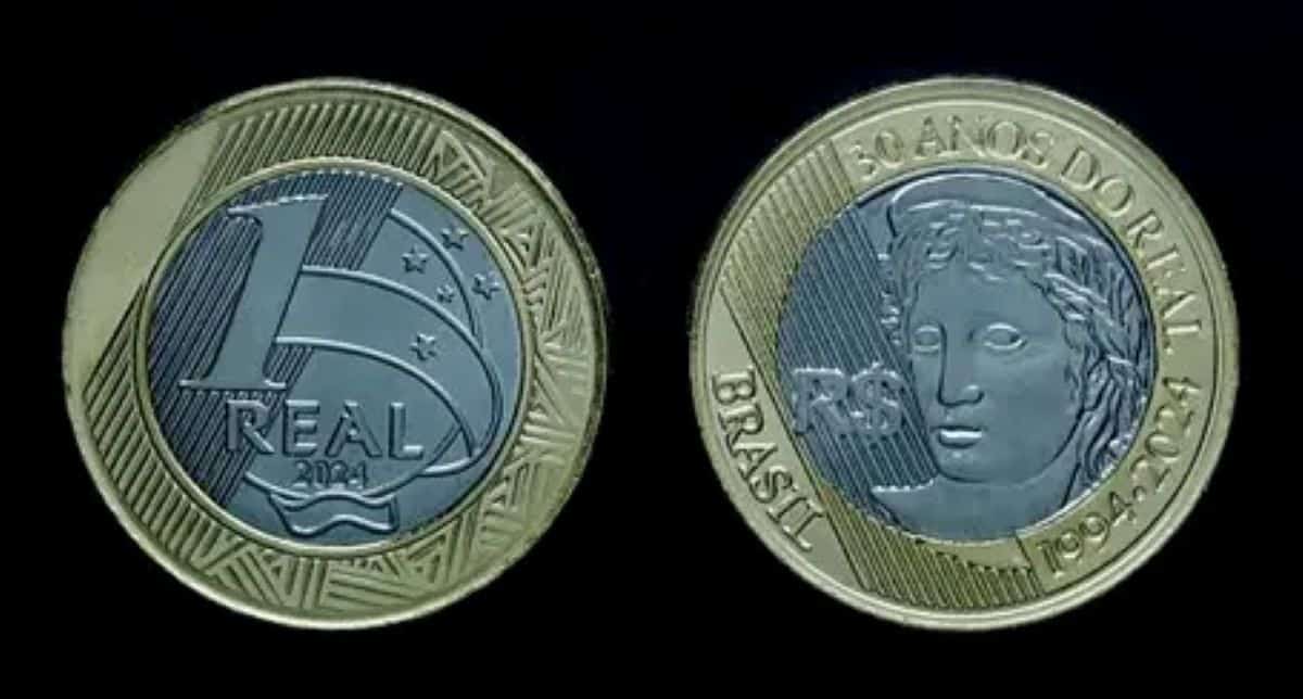 A moeda comemorativa de 1 real alusiva aos 30 anos do plano real chama atenção pela figura feminina que representa a República e pela inscrição que marca de forma clara o período homenageado: “30 anos do real de 1994 a 2024”, além da palavra “Brasil” em destaque no campo liso do lado esquerdo. Já o reverso segue o padrão conhecido, exibindo o grafismo indígena marajoara, o valor facial e as estrelas do Cruzeiro do Sul.