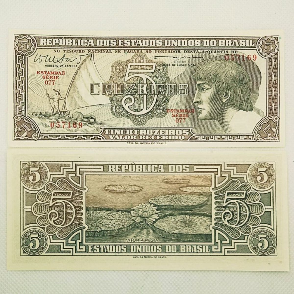 Frente e verso da cédula rara de 5 cruzeiros com a imagem de um índio, mostrando seu design e detalhes.