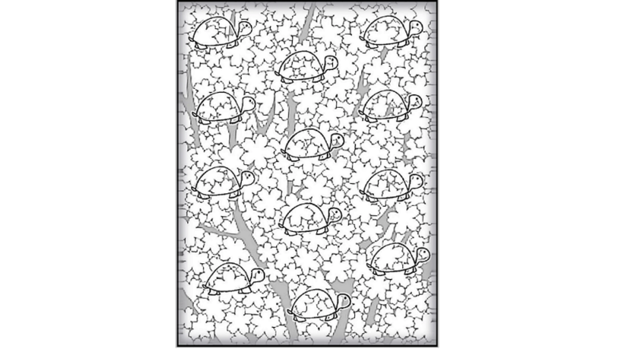 Imagine-se em um cenário com árvores altas e flores, e entre elas, doze tartarugas espalhadas. No entanto, há uma delas que se destaca, um perfil diferente das demais. Será que você consegue encontrá-la?